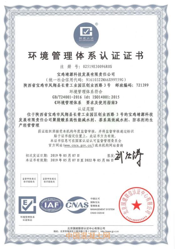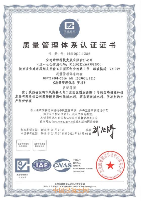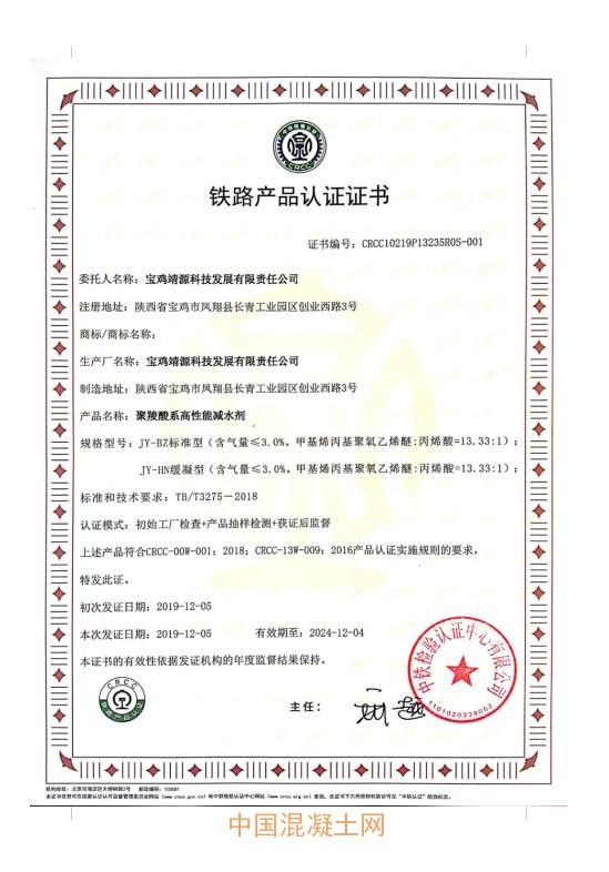 2019年,公司通過了ISO9001質(zhì)量管理體系認(rèn)證、ISO14001環(huán)境管理體系認(rèn)證、OHSAS18001職業(yè)健康安全管理體系認(rèn)證、混凝土外加有害物質(zhì)限量認(rèn)證、CRCC鐵路產(chǎn)品認(rèn)證。