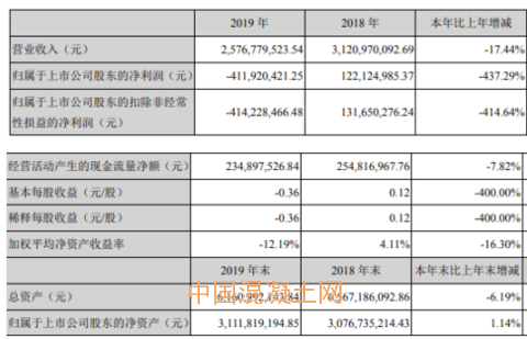 據(jù)了解,2019年度,公司實現(xiàn)營業(yè)收入257,677.95萬元,較上年同期下降17.44%;實現(xiàn)歸屬于上市公司股東的凈利潤-41,192.04萬元,較上年同期下降437.29%。商品混凝土銷售量較上年同期下降30.63%,同時受生產(chǎn)混凝土所需水泥、河沙、碎石等原材料價格上升的影響,公司商品混凝土毛利率下滑,營業(yè)利潤下降。