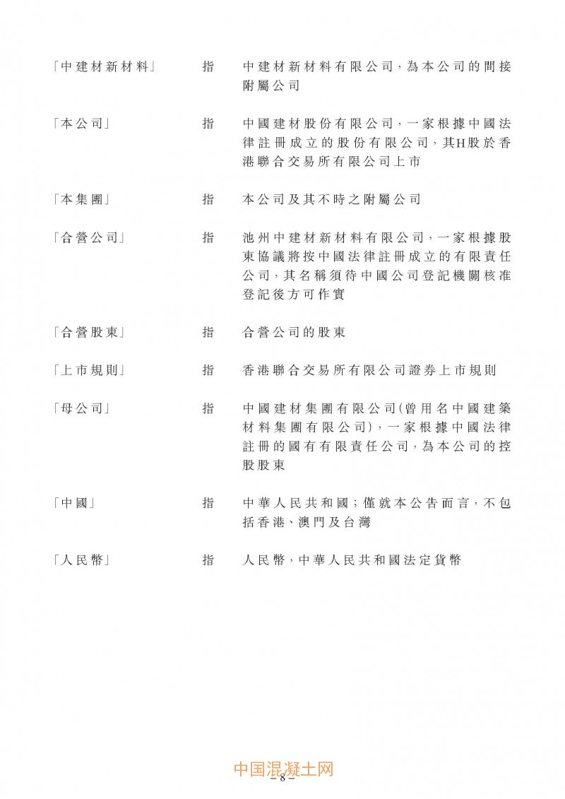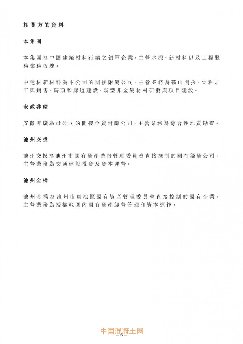 合營公司的注冊資本為人民幣10億元(單位下同),中建材新材料、安徽非礦、池州交投、池州金橋及池州建投同意分別認繳6億元、1億元、1億元、1億元及1億元,分別占合營公司注冊資本的60%,10%,10%,10%及10%設立合營公司有利于發揮出公司建設綠色礦山、打造高品質砂石骨料的管理及技術能力,并且為下游企業產業升級、生產高品質混凝土提供原材料的保證,具有明顯的經濟和社會效益。