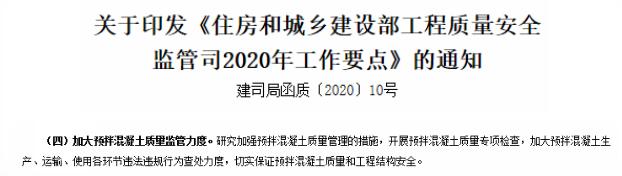 4月8日,住建部官網發布關于印發《住房和城鄉建設部工程質量安全監管司2020年工作要點》的通知(司局函質〔2020〕10號) 稱住房和城鄉建設部工程質量安全監管司2020年工作要點包括開展預拌混凝土質量專項檢查,加大預拌混凝土生產、運輸、使用各環節違法違規行為查處力度,切實保證預拌混凝土質量和工程結構安全。
