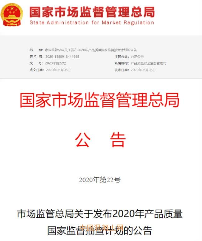 與此同時,湖北、陜西、河南等多個省市地區陸續下發了2020年產品質量國家監督抽查計劃及細則。