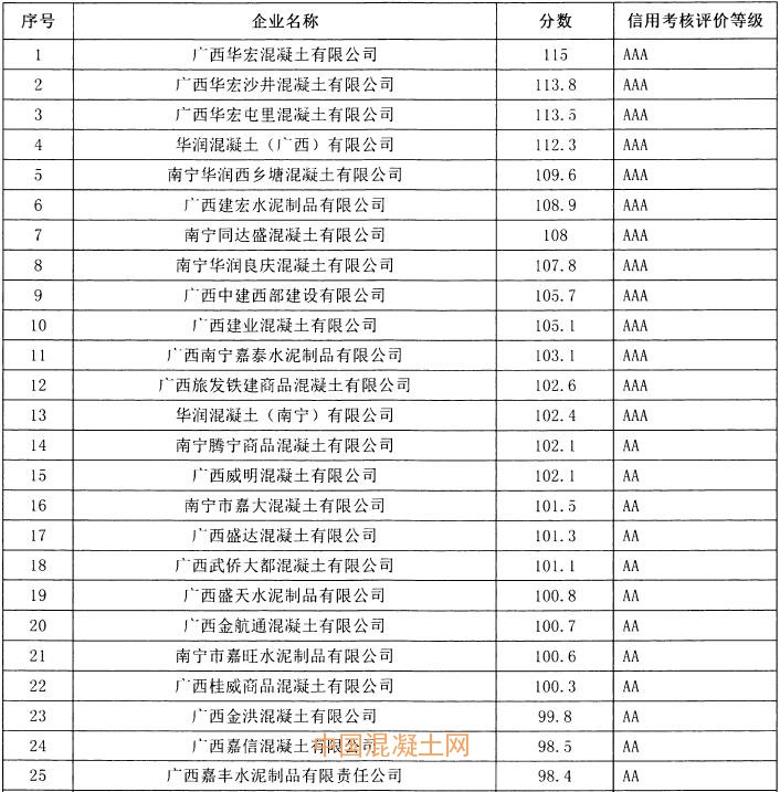 在此次獲A級(jí)及以上評(píng)級(jí)的64家企業(yè)中,廣西華宏混凝土有限公司、華潤(rùn)混凝土(廣西)有限公司、廣西建宏水泥制品有限公司等13家企業(yè)獲AAA級(jí),南寧騰寧商品混凝土有限公司、廣西威明混凝土有限公司 、南寧市嘉大混凝土有限公司等36家企業(yè)獲AA級(jí),南寧市武鳴華泰混凝土有限公司、隆安縣大偉混凝土有限公司、南寧興典混凝土有限責(zé)任公司等15家企業(yè)獲A級(jí)。