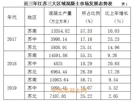 在省委、省政府“加快發(fā)展蘇中、蘇北”和“蘇南、蘇中、蘇北協(xié)同發(fā)展”的戰(zhàn)略部署背景下,2018年,蘇中、蘇北混凝土市場需求增長迅猛,兩大區(qū)域混凝土產量11789萬立方米,比2017年增長18.63%,占全省總量的44.68%;2019年,兩大區(qū)域增長速度明顯回落,混凝土產量12198.44萬立方米,僅比上年增長3.47%,占全省總量的43.28%。
