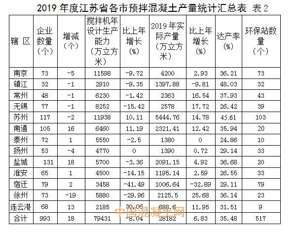 1、受宏觀調控、環(huán)保整治和部分企業(yè)經營管理不善等因素的影響,2019年全省關閉或停產了一批非環(huán)保攪拌站。同時,全省又新建了一些綠色環(huán)保站。據統(tǒng)計匯總,至2019年底,建筑系統(tǒng)有資質的混凝土企業(yè)共993家,混凝土攪拌機年設計生產能力為79431萬立方米,比上年下降了8.04%;全行業(yè)平均產能利用率為35.48%,比上年提高4.28%。