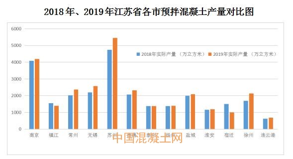 蘇北的徐州、淮安、鹽城、連云港和宿遷5市的混凝土產量達7107.03萬立方米,占全省總方量的25.22%,比上年回落1.07個百分點。其中,鹽城市所屬1個地級市,2個縣級市和5個縣,2019年混凝土產量2091.15萬立方米,比去年增長4.92%。淮安市所屬1個地級市和4個縣混凝土產量1195.14萬立方米,比上年度增長2.59%。徐州市有1個地級市和5個縣,全年產量2125.5萬立方米,增長幅度為25.68%,是全省增幅最大的地區(qū)。宿遷市所屬1個地級市和3個縣,混凝土產量1006.64萬立方米,比上年下降32.89%,是全省下降幅度最大的地區(qū)。連云港市所屬1個地級市和4個縣,產量688.6萬立方米,比上年增長11.95%。