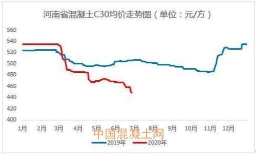 截止到6月30日,河南省混凝土C30均價為449元/方,較2020年初下跌86元/方。