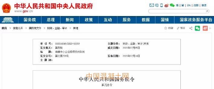 《保障中小企業款項支付條例》(中華人民共和國國務院令第728號)正式發布,自2020年9月1日起施行。