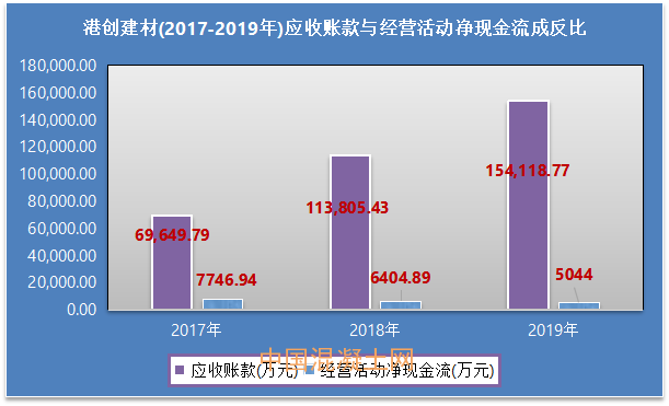 就一家企業運營活動而言,應收賬款持續居高不下,等同于經營活動中難以收回現金。從港創建材招股說明書中可知,港創建材2017年至2019年經營活動凈現金流分別為7746.94萬元、6404.89萬元、5044.00萬元,由此可見,公司應收賬款逐年增長的同時,經營活動凈現金流逐漸降低。