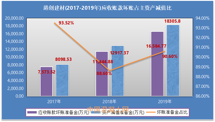 而應收賬款壞賬準備金攀升又會直接造成主要資產減值準備金升高,從招股說明書中可知,港創建材2017年至2019年應收賬款壞賬準備金額分別為7,573.52萬元、11,444.88萬元、16,584.77萬元,同期主要資產減值準備金額分別為8,098.53萬元、12,917.37萬元、18,305.80萬元,應收賬款壞賬準備金分別為同期主要資產減值準備金額總量的93.52%、88.60%、90.60%,對于應收賬款的管理,港創建材尚有較大提升空間。