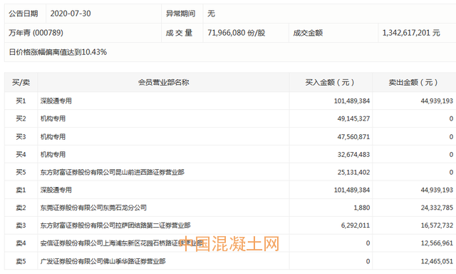 7月30日截至收盤,萬年青漲停,報18.81元/股,全天成交13.43億元。