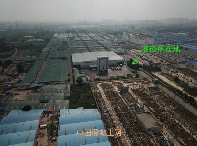 記者在現場通過航拍圖觀察,該商砼占地面積頗大,僅院內西側院墻下,就劃有14個供大型水泥罐車停靠的停車位,商砼整體呈“U”字型內嵌于其背后的一座建材批發市場當中。