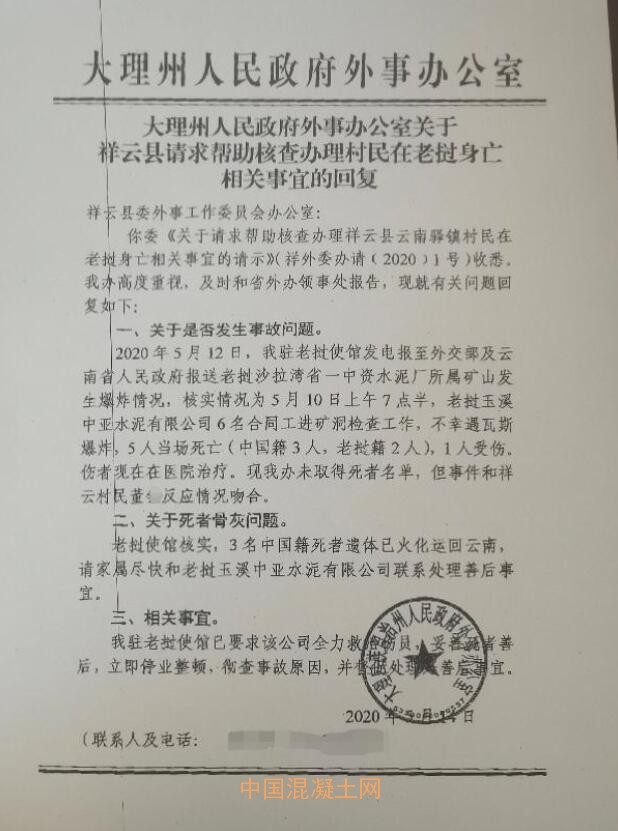 董女士告訴記者,5月14日,大理州人民政府外事辦公室曾發(fā)布關(guān)于祥云縣請求幫助核查辦理村民在老撾身亡相關(guān)事宜的回復(fù),其提供的相關(guān)文件顯示,5月10日上午,涉事公司6名工人進(jìn)礦洞開展工作,不幸遭遇瓦斯爆炸,事故造成5人死亡(中國籍3人,老撾籍2人),1人受傷。經(jīng)核實(shí),3名中國籍死者遺體已火化運(yùn)回云南,請家屬盡快和老撾玉溪中亞水泥有限公司聯(lián)系處理善后事宜。我駐老撾使館已要求該公司全力救治傷員,妥善死者善后,立即停業(yè)整頓,徹查事故原因,并督促處理善后事宜。7月23日,祥云縣外事辦有關(guān)負(fù)責(zé)人告訴記者,確有收到該份文件。