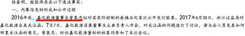 7月30日證監會網站曾在晚間更新一則行政處罰決定書,證監會對時任美福石化監事殷張偉內幕交易嘉化能源股票的行為進行了處罰。在2017年嘉化能源對美福石化重組并購期間,時任嘉化能源董事長管建忠與殷張偉密集聯系,是該案件的另一位當事人。