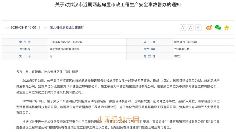 據湖北省住房和城鄉建設廳8月11日發布的《關于對武漢市近期兩起房屋市政工程生產安全事故督辦的通知》顯示,2020年7月31日,位于武漢市江漢區的首地航站樓新建服務業設施項目發生一起高處墜落事故,造成1人死亡;當日另一起事故為,位于武漢市東西湖區的新能源自動檢測裝備、數控自動裝備2#廠房項目發生一起高處墜落事故,造成1人死亡。