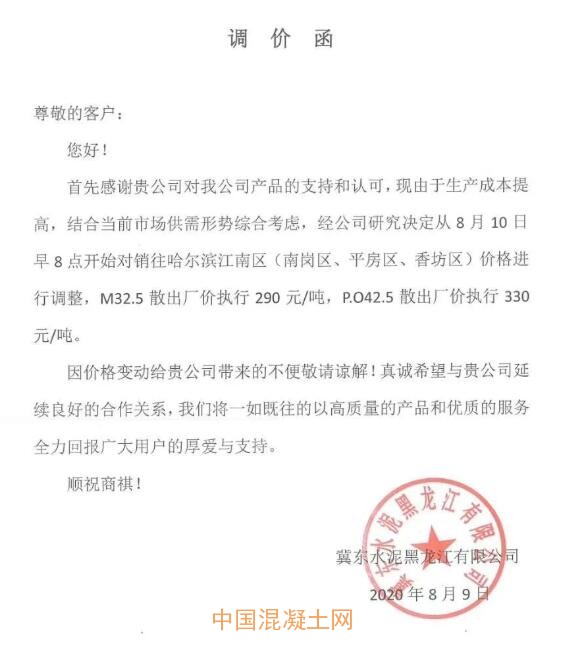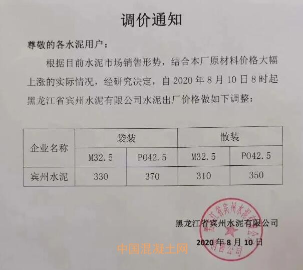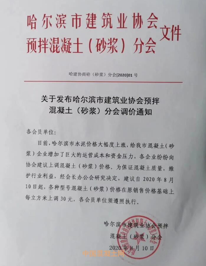 近日,哈爾濱市建筑業(yè)協(xié)會預(yù)拌混凝土(砂漿)分會發(fā)布調(diào)價通知。通知稱,目前哈爾濱市水泥價格大幅度上漲,本地水泥短時間內(nèi)經(jīng)過兩輪調(diào)價后暴漲100元,當(dāng)?shù)鼗炷粒ㄉ皾{)企業(yè)運營成本和資金壓力巨大!為保障混凝土質(zhì)量,建議自2020年8月10日起,各種型號混凝土(砂漿)價格在原銷售價格基礎(chǔ)上每立方米上調(diào)30元!