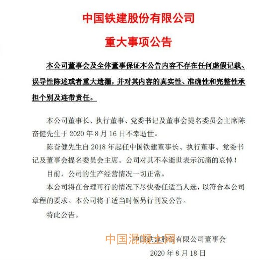 中國鐵建發布的重大事項公告稱,本公司董事長、執行董事、黨委書記及董事會提名委員會主席陳奮健先生于2020年8月16日不幸逝世。陳奮健自2018年起任中國鐵建董事長、執行董事、黨委書記及董事會提名委員會主席。公司對其不幸逝世表示沉痛的哀悼!目前,公司的生產經營情況一切正常。