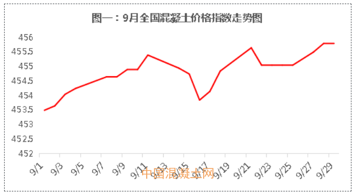 截止9月30日,混凝土指數為456,環比上漲0.21%,從下圖可以看出,全國混凝土指數呈現,原本“金九銀十”是傳統旺季,市場行情理應一片漲勢,但由于今年疫情、雨季持續等各種不可控因素,全國混凝土價格呈漲跌互現態勢。