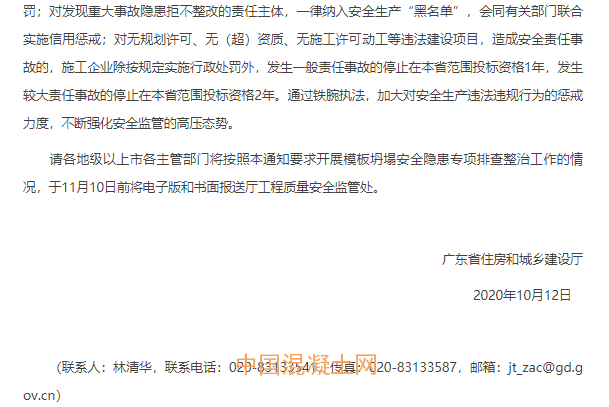 10月12日,廣東省住房和城鄉(xiāng)建設(shè)廳發(fā)布《關(guān)于深刻汲取汕尾陸河“10·8”較大事故教訓(xùn)開展模板坍塌安全隱患專項(xiàng)排查整治的緊急通知》,要求從即日起,全省所有房屋市政工程工地的混凝土澆筑暫停作業(yè),各地各主管部門迅速組織開展針對(duì)模板支撐體系安全隱患的專項(xiàng)排查整治,經(jīng)工程項(xiàng)目參建五方責(zé)任主體確認(rèn)自查整改到位、經(jīng)屬地主管部門復(fù)查同意后方可復(fù)工。