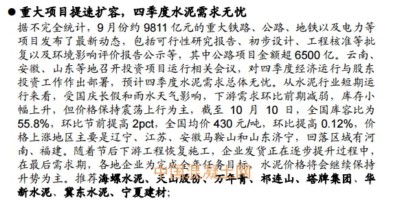如江蘇市場反饋,國慶假期后江蘇地區天氣晴好為主,市場需求恢復較快。9月下旬江蘇中北部地區水泥價格普漲30-40元/噸;蘇錫常地區一些主要廠家10月10日起通知上調各品種水泥價格30元/噸左右,區域其余同業預計稍晚幾日跟進。