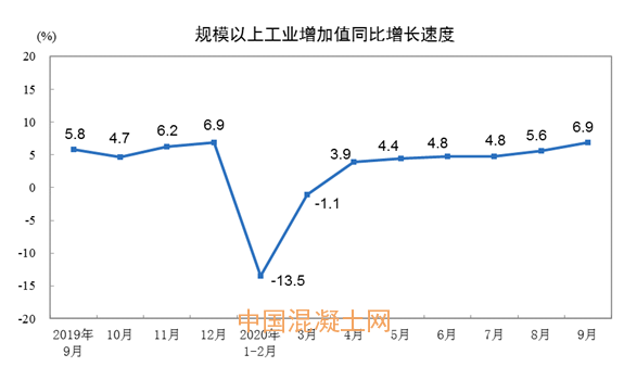 據國家統計局發布數據顯示,9月份,規模以上工業增加值同比實際增長6.9%(以下增加值增速均為扣除價格因素的實際增長率),增速較8月份加快1.3個百分點。從環比看,9月份,規模以上工業增加值比上月增長1.18%。1月至9月,規模以上工業增加值同比增長1.2%。其中,水泥產量167627萬噸,同比下降1.1%。