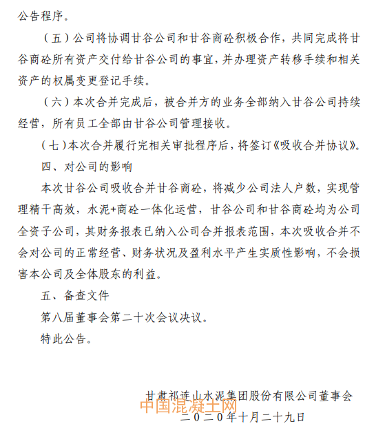 甘肅祁連山水泥集團股份有限公司(以下簡稱“公司”)董事會于 2020年10月28日召開第八屆董事會第二十次會議,審議通過了《關(guān)于公司下屬甘谷祁連山水泥有限公司吸收合并甘谷祁連山商砼有限公司的議案》,同意公司下屬甘谷公司吸收合并甘谷商砼,并將甘谷商砼進行注銷。本次吸收合并不構(gòu)成關(guān)聯(lián)交易,亦不構(gòu)成重大資產(chǎn)重組。該事項經(jīng)公司董事會審議通過后尚需提交公司股東大會審議。