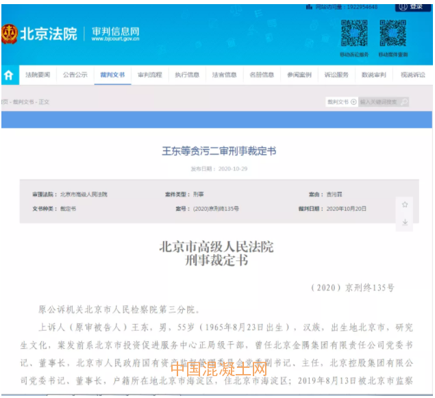 10月29日,北京法院審判信息網公開發布王東等貪污二審刑事裁定書。原北京金隅集團有限責任公司黨委書記、董事長王東因犯受賄罪、貪污罪,被判處有期徒刑11年,并處罰金120萬元。