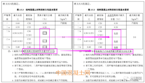 1 表3.5.3的結構混凝土材料耐久性基本要求將氯離子含量由“占膠凝材料總量百分比”改為“占水泥用量的質量百分比”,二b、三a、三b環境的氯離子最大含量數值要求分別從0.15%、0.15%、0.10%加嚴為0.10%、0.10%、0.06%。