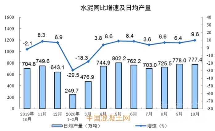 2020年1-10月份,全國累計水泥產量19.20億噸,同比增長0.4%。10月份,全國單月水泥產量2.41億噸,同比增長9.6%。