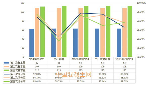 其中,管理信息平臺、原材料質量管理兩項指標的平均得分率均超過了90%,企業試驗室的得分率接近90%(為89.01%),生產管理低于80%。具體得分率分布及與第一次和第二次平均得分情況的對比見圖2。
