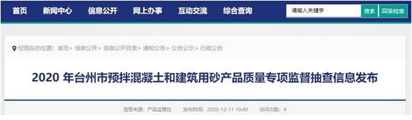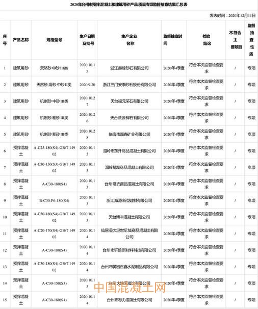 據(jù)浙江省臺州市市場監(jiān)督管理局網(wǎng)站消息,近期,根據(jù)《中華人民共和國產(chǎn)品質(zhì)量法》、《浙江省產(chǎn)品質(zhì)量監(jiān)督條例》等規(guī)定,臺州市市場監(jiān)督管理局組織開展了2020年臺州市預拌混凝土和建筑用砂產(chǎn)品質(zhì)量專項監(jiān)督抽查,抽查了臺州市預拌混凝土、建筑用砂等2種(類)15家企業(yè)的15批次產(chǎn)品,合格15批次,批次合格率為100%。