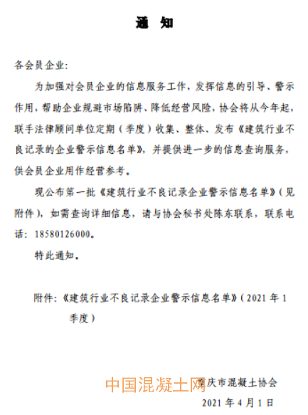 近日,重慶市混凝土協會發布通知稱,為幫助企業規避市場陷阱、降低經營風險,協會將從今年起,聯手法律顧問單位定期(季度)收集、整理、發布《建筑行業部分擁有不良記錄的企業警示信息名單》,并提供進一步的信息查詢服務。
