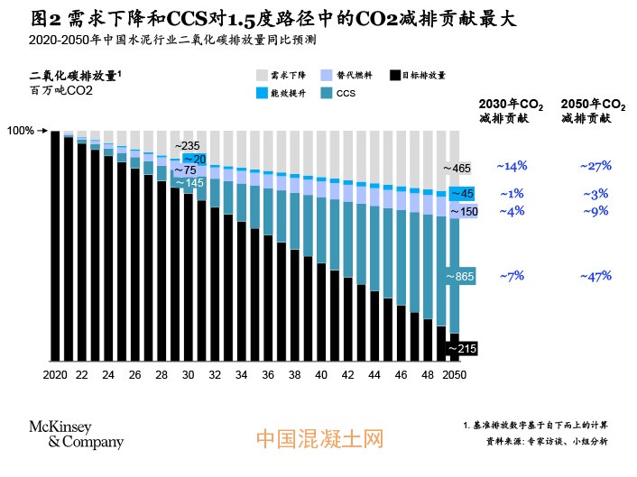 綜合能源轉(zhuǎn)型委員會(ETC)、國際能源署(IEA)、麥肯錫全球水泥需求預測模型以及中國水泥行業(yè)專家的意見,我們預計常規(guī)情形下的需求下降到2050年將貢獻中國水泥行業(yè)約27%的碳減排,其主要動因是城市化和建筑業(yè)的增速放緩。隨著我國城市化率趨于穩(wěn)定,GDP驅(qū)動的水泥需求預計會進一步下降,現(xiàn)有建筑的維修和更新將逐漸主導未來的水泥需求。此外,混凝土的替代建材(例如鋼、預制材料、交錯層積木材等)也將進一步降低水泥需求。然而,需求預測的準確性受城市化和建筑業(yè)發(fā)展實際情況的影響,若需求下降不及預期,則需要依靠其他抓手推動碳減排,特別是碳捕集與封存(CCS)。