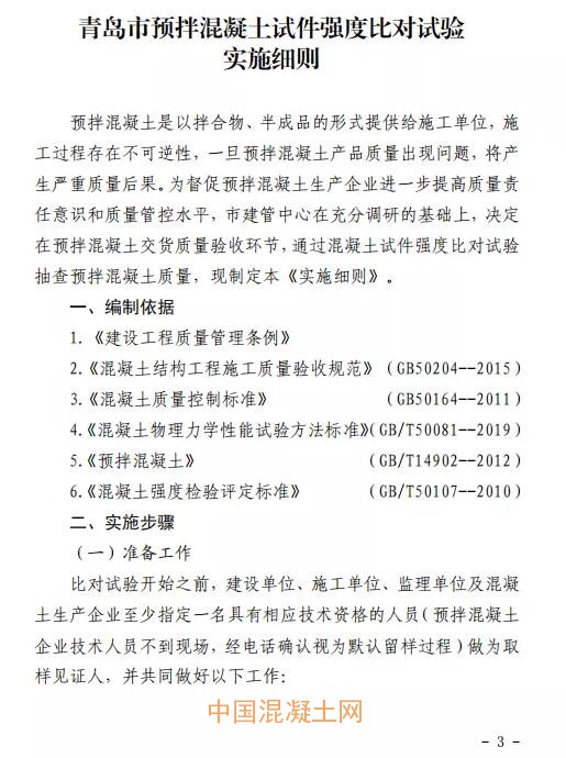 為督促預拌混凝土生產企業進一步提高質量責任意識和質量管控水平,近日,青島市建筑工程管理服務中心在充分調研的基礎上,決定在預拌混凝土交貨質量驗收環節,通過混凝土試件強度比對試驗抽查預拌混凝土質量,現已印發《青島市預拌混凝土試件強度比對試驗實施細則》。