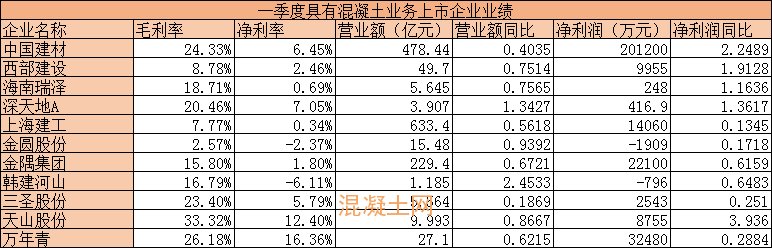 4月底各大具有混凝土業務的上市企業陸續發布一季度業績報告,其中上海建工取得一季度633.4億營業額;天山股份凈利潤同比增幅最大。以下為上市企業一季度業績明細。