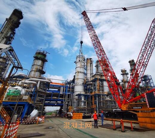 該部2號乙二醇裝置正在實施精制單元干燥塔更換的吊裝作業。