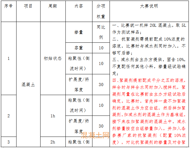 ②采用比賽規定的混凝土配合比,比賽前一周主辦方向各參賽單位公布所有原材料配合比以及減水劑、絮凝劑和抗絮凝劑摻量。
