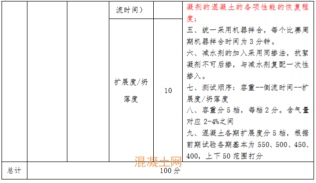 (1)現場檢查摻量、配合比、混凝土容重、倒流時間、擴展度/坍落度,并現場記錄,便于評分;