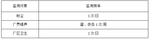 9.0.4粉塵、廠界噪聲、廠區(qū)衛(wèi)生監(jiān)測頻率應(yīng)符合表9.0.4的規(guī)定。監(jiān)測應(yīng)有記錄。