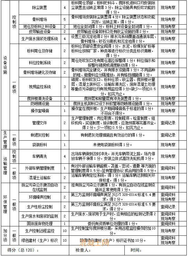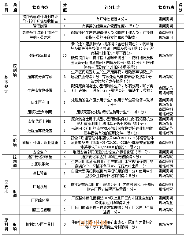 3.0.5新建混凝土攪拌站應(yīng)按本標(biāo)準(zhǔn)有關(guān)規(guī)定進(jìn)行建設(shè)和驗收,并定期按附錄A評分表進(jìn)行檢查,檢查得分不應(yīng)低于90分且控制項 不應(yīng)扣分。