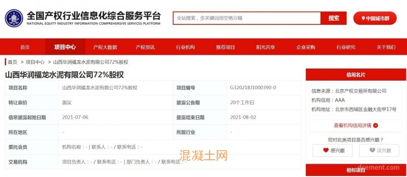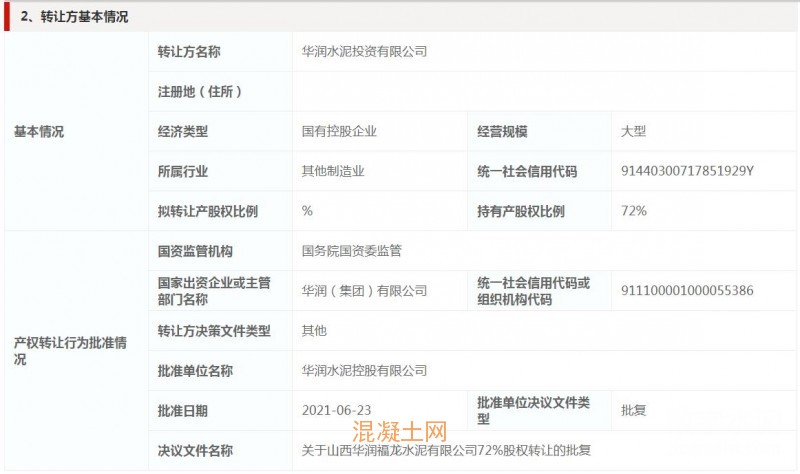 根據全國產權行業信息化綜合服務平臺上發布的內容顯示,華潤水泥投資有限公司掛牌轉讓山西華潤福龍水泥有限公司72%股權,轉讓底價為面議,信息披露起始日期為2021年7月6日-2021年8月2日。詳情如下: