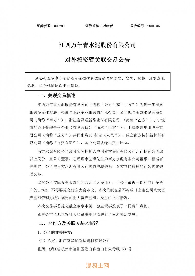 萬年青(000789.SZ)公布,公司(“丁方”)為進一步探索相關多元化發展,拓展與水泥主業相關的產業投資,公司擬與南方水泥有限公司(“甲方”)、浙江富澤通新型建材有限公司(“乙方”)、寧波南加企業管理合伙企業(有限合伙)(“丙方”)、上海愛建集團股份有限公司(“戊方”)共同出資10億元人民幣,成立南方杭加新材料有限公司(“合資公司”),其中公司認繳出資占比5%。