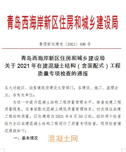 近日,青島市西海岸新區(qū)住房和城鄉(xiāng)建設(shè)局發(fā)布了《關(guān)于2021年在建混凝土結(jié)構(gòu)(含裝配式)工程質(zhì)量專項(xiàng)檢查的通報(bào)》。通報(bào)顯示,本次共檢查工程57個(gè),下發(fā)整改通知書57份,提出整改意見(jiàn)555條,對(duì)工程責(zé)任主體罰款總額13.1萬(wàn)元,扣除信用考核分365分。其中,中建三局第一建設(shè)有限公司、天元建設(shè)集團(tuán)有限公司、江蘇省建工集團(tuán)有限公司施工的三個(gè)項(xiàng)目工程因質(zhì)量管理較差被官方通報(bào)。