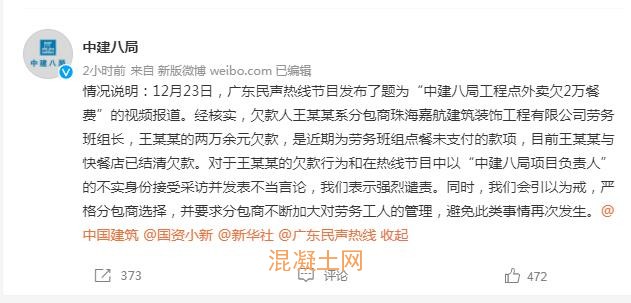 12月23日,廣東民聲熱線節目發布了題為“中建八局工程點外賣欠2萬餐費”的視頻報道。經核實,欠款人王某某系分包商珠海嘉航建筑裝飾工程有限公司勞務班組長,王某某的兩萬余元欠款,是近期為勞務班組點餐未支付的款項,目前王某某與快餐店已結清欠款。對于王某某的欠款行為和在熱線節目中以“中建八局項目負責人”的不實身份接受采訪并發表不當言論,我們表示強烈譴責。同時,我們會引以為戒,嚴格分包商選擇,并要求分包商不斷加大對勞務工人的管理,避免此類事情再次發生。