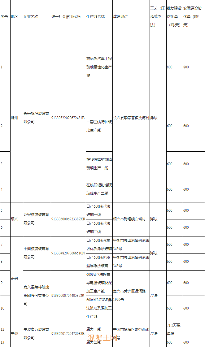 表二 浙江省2021年度平板玻璃生產線清單(截至2021年12月31日)
