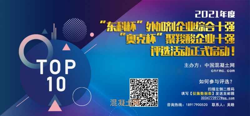 中國混凝土網自2010年舉辦十強企業評選活動以來,受到眾多業內人士的關注與支持。目前2021年度“東科杯”外加劑企業綜合十強,“奧克杯”聚羧酸企業十強評選活動已正式啟動,中國混凝土網秉著公平、公開的原則,現在全國范圍內公開征集混凝土外加劑企業銷售及企業規模等數據,我們將通過對各項數據的權重比較得出最終排名。望相關企業能夠積極踴躍參與,共同推動外加劑行業的繁榮與發展!