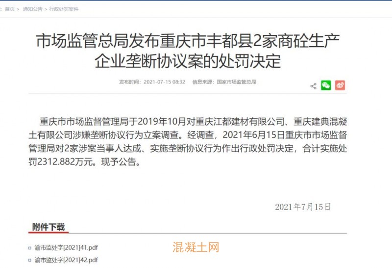 2021年7月15日,市場監管總局發布重慶市豐都縣2家商砼生產企業壟斷協議案的處罰決定。處罰決定顯示,合計實施處罰2312.882萬元。