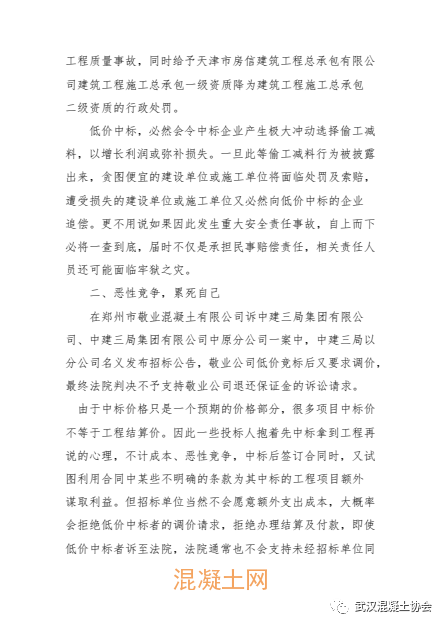 今日(21日),武漢混凝土協會發布《混凝土行業低價中標危害及倡議》,號召全體會員企業堅決抵制低價中標行為,呼吁招標單位在項目招標中修改“經評審的最低投標價法”模式,采用“經評審的平均投標價法”。建議政府職能部門加強對低價中標項目的監管和巡查力度。