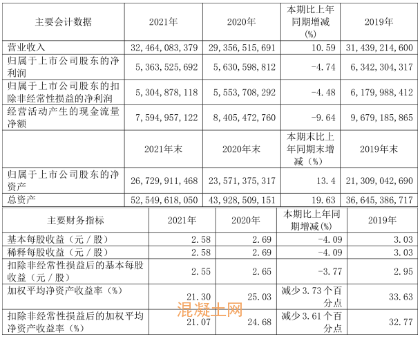 華新水泥(600801)3月30日披露2021年年度報告。2021年,公司實現營業收入324.64億元,同比增長10.59%;歸母凈利潤53.64億元,同比下降4.74%;扣非凈利潤53.05億元,同比下降4.48%;經營活動產生的現金流量凈額為75.95億元,同比下降9.64%;報告期內,華新水泥基本每股收益為2.58元,加權平均凈資產收益率為21.30%。公司2021年度分配預案為:擬向全體股東每10股派10.00元(含稅)。