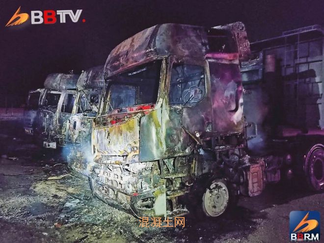 其中3輛自卸貨車車頭已經(jīng)被完全燒穿,損毀嚴重,另外一輛攪拌車被波及,不同程度損毀。