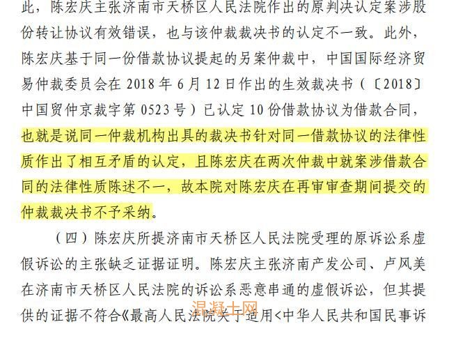 記者獲取的裁定書顯示,對于貿仲會在2018年6月12日、2022年2月22日所做的兩份裁決,山東省高院認為:“同一仲裁機構出具的裁決書針對同一借款協議的法律性質作出了相互矛盾的認定,且陳宏慶在兩次仲裁中就案涉借款合同的法律性質陳述不一,故本院對陳宏慶在再審審查期間提交的仲裁裁決書不予采納。”